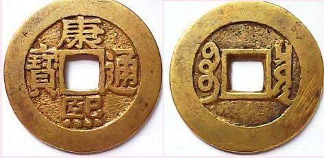 康熙通宝有小平及当十大钱。钱文真书体,直读。除宝源、宝泉二局以满文纪局外,各省均以满汉字纪局名,穿左铸满文,穿右铸汉文。