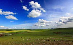 绿草与蓝天相接,微风吹来,牧草飘动,处处都是“风吹草低见牛羊”的景致。夏季的大草原温润宜人,鸟语花香,大片大片的嫩绿治愈人心。