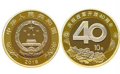 双色铜合金纪念币背面主景图案为阿拉伯数字“40”,背景图案为牡丹花、飘带和礼花。主景图案上方刊“庆祝改革开放40周年”字样,右下方刊面额“10元”字样。