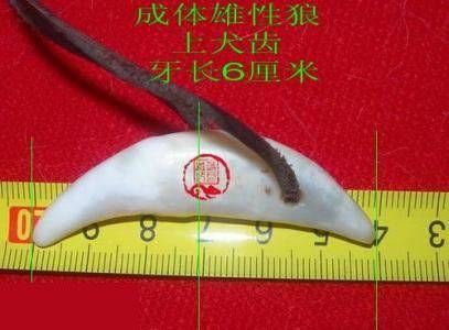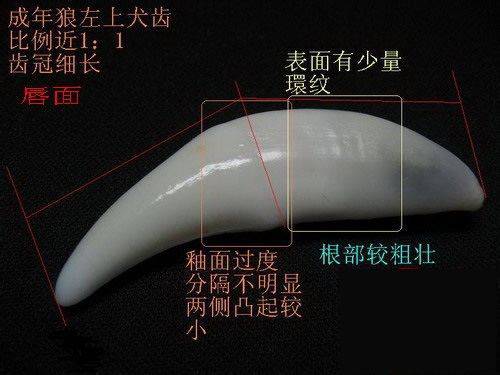 狼牙先看尺寸,整牙尺寸在4.5cm-6.3cm之间且牙根愈合。亚成牙尺寸在3cm-4.3cm约为1龄狼,齿根从空心到近愈合2.5cm以下幼狼牙,只是牙尖(齿冠),乳齿刚刚脱落,根部刚刚开始形成,为6-7月龄 2.看比例。上犬齿 亚成狼的比例为1.2:1或1:1 由于牙根还未完全成熟,还在发育中。成狼为1:1(4-7年龄)或1:1.2(总长超过5.5-6.3厘米或雌性多见)下犬齿,11.1-1.3,下犬齿多为根部稍长看狼牙的裂纹,齿冠有横向细微裂纹,裂纹限于齿冠的釉质表层,多有血色(干后铁锈色)4.看牙根的型,(部分牙的尖部常有缺损)狼牙牙根较为饱满,但是满而不空,不像某些狗牙那样感觉浮肿,两侧少有凹陷,弧度匀称。雌性牙较光滑,有环纹但较狗平滑,雄性牙根部有质感,厚实但表面不毛糙。
