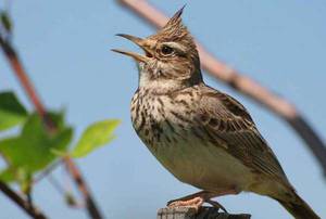 云雀(学名:Alauda arvensis)小型鸣禽,体型及羽色略似麻雀,雄性和雌性的相貌相似。背部花褐色和浅黄色,胸腹部白色至深棕色。外尾羽白色,尾巴棕色。后脑勺具羽冠,适应于地栖生活,腿、脚强健有力,后趾具1长而直的爪;跗跖后缘具盾状鳞;以植物种子、昆虫等为食,常集群活动;繁殖期雄鸟鸣啭洪亮动听,是鸣禽中少数能在飞行中歌唱的鸟类之一。求偶炫耀飞行复杂,能“悬停”于空中;在地面以草茎、根编碗状巢,每窝产卵3-5枚,孵化期10-12天。