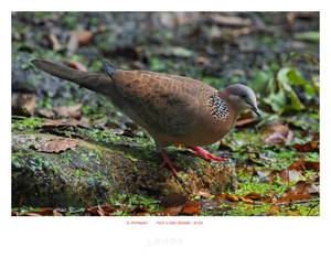 雄鸟前额淡蓝灰色,到头顶逐渐变为淡粉红灰色;枕、头侧和颈粉红色,后颈有一大块黑色领斑,其上布满白色或黄白色珠状似的细小斑点,上体余部褐色,羽缘较淡。中央尾羽与背同色,但较深些;外侧尾羽黑色,具宽阔的白色端斑。翼缘、外侧小覆羽和中覆羽蓝灰色,其余覆羽较背为淡。飞羽深褐色,羽缘较淡。颏白色,头侧、喉、胸及腹粉红色;两胁、翅下覆羽、腋羽和尾下覆羽灰色。嘴暗褐色,脚红色。