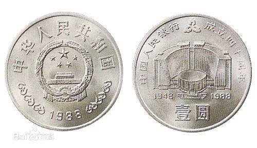 为纪念中国人民银行成立40周年,中国人民银行于1988年12月发行中国人民银行成立40周年纪念币,面值为1元,每套1枚。