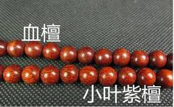 小叶紫檀和血檀最大的区别就是紫檀比血檀密度大,同料体积的紫檀要比血檀重,按标准的的2.0来说,小叶紫檀重量大概在65克左右,血檀大概只有60克左右,有些密度低的血檀甚至不沉水,而小叶紫檀则颗颗沉水,其次是味道,小叶紫檀味道虽然很淡,但是在手里或者布袋里揉搓一下还是可以闻到淡淡的香气,而血檀味道有股酸味,和酸枝味道类似。