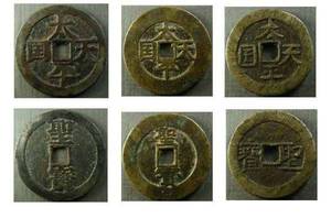 太平天国的大钱,正面书写太平天国,背面一般是“圣宝”。太平军的货币除初期名称为通宝外,其余均称为圣宝。