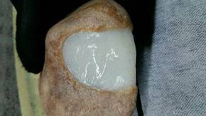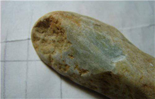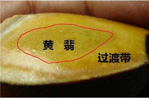 第三种皮肉不分:这个原石,不仅没有雾层,而且石皮和翡翠的界限不很明显甚至是呈现出逐步过渡,如下图
