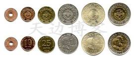 1995年发行第六版,现行流通币有:1、5、10、25分;l、5、10比索。