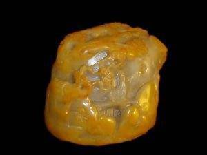 19、蜜蜡黄玉:是因其颜色如同黄色蜜蜡而得名,是一种白云石组成的白云岩致密块体。质地较好,抛光后色泽柔和滋润,有明显的蜡状光泽,一般不透明,外观很似和田黄玉。