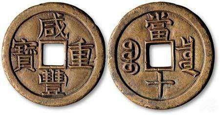 咸丰铜钱 有些朋友们喜欢集藏我国古钱币。虽然近几年来古币升值率远远不及我国近代珍罕的邮票和字画,但是仍不乏“发烧友”锲而不舍,作为一种生活情趣。 咸丰铜钱的版别很难逐一罗列;其文字书写的特点就不同,同局所铸同一级钱,有大、小之分,穿、缘有宽狭,字体有甚细微差别。像宝泉局拾文钱,有一种方山丰(二竖直立者),双王直脚宝,就极罕见。事实上,咸丰铜钱大小错出,轻重倒置;当时各省竞造,无奇不有,异常混乱。光是研究那个时期的钱币,已属一大学问。故奉劝初入门者,切勿误信他人而乱买,很易上当。 识者则皆知那时宝泉局当五钱存世约近十枚,一种面文接近戴熙手笔(亦称“戴书当五”),与另一种楷书当五皆为母钱、样钱,铸咸丰重宝当十价值多少?