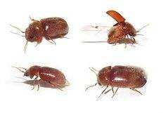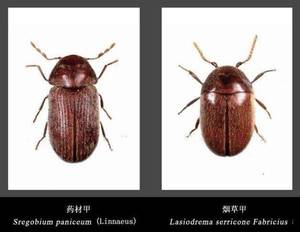 第一张和最后一张,像是药材甲或烟草甲,是常见的储藏物害虫,个体小,有趋光性。中间那个看不准,可能是某种千足虫的一部分。