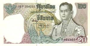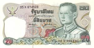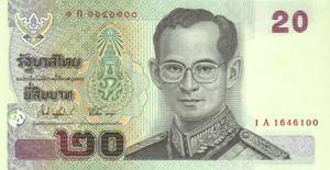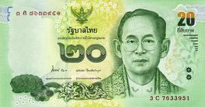 这是泰国发行的20泰铢纸币。纸币正面戴眼镜的人像是泰国国王普密蓬——拉玛九世国王。按目前汇率:泰铢与人民币汇率是:1泰铢=0.1952人民币元,所以20泰铢纸币可以兑换成3.9元人民币左右。