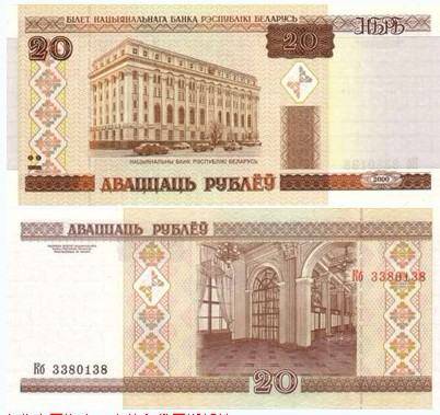 这是白俄罗斯2000年发行的20卢布纸币,纸币正面是位于白俄罗斯首都明斯克的国家银行大楼,背面是国家银行大楼内部一角。