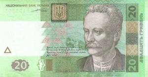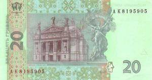 这是乌克兰的纸币,面额20格里夫纳。纸币正面是乌克兰作家伊凡·弗兰科,背面是乌克兰利沃夫歌剧院。图中的纸币看起来是真的。