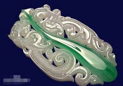 (2)商品级:绿色,油青地,微透明、间杂半透明的祖母绿色细脉和斑点翠。
