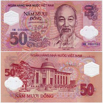 这是越南2001年发行的“越南国家银行成立50周年”塑料纪念钞,面额50盾。发行量15万枚。正面是胡志明,背面是越南国家银行的办公大楼。