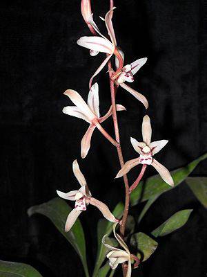 兔耳兰,半附生植物,假鳞茎近扁圆柱形或狭梭形,有节,多少裸露,顶端聚生2––4枚叶,叶倒披针状长圆形至狭椭圆形,叶柄长3—18厘米,花葶从假鳞茎下部侧面节上发出,直立,花序具2—6朵花,较少减退为单花或具更多的花,花通常白色至淡绿色,花瓣上有紫栗色中脉,唇瓣上有紫栗色 斑,花期5––8月,产浙江南部、福建、台湾、湖南南部、广东、海南、广西、四川南部、贵州、云南 和西藏东南部,生于疏林下、竹林下、林缘、阔叶林下或溪谷旁的岩石上、树上或地 上,海拔300––2200米。