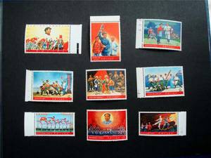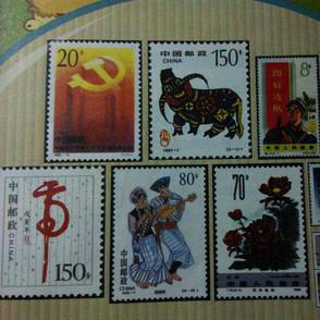 五、邮票上的志号:新中国成立后,中国人民邮政发行的纪念邮票和特种邮票,在票面底部印有邮票发行序号和年代,称志号。如1952年7月7日发行的,《抗日战争十五周年纪念》邮票,在邮票底部左边印有"纪16.4-1""纪16"表示这套邮票是纪念邮票的第16套;"4-1"表示这套邮票有4枚,这是第一枚。邮票底部右边印有"(78)1952",(78)表示管枚邮票在纪念邮票里的总编号,"1952"是这套邮票的印制年代。中国首次便使用"纪"字头发行邮票,是从1949年10月8日的纪1《庆祝中国人民政治协商会议第一届全体会议》开始,到1967年3月10日纪124《向32111英雄钻井队学习》邮票止。其间共发行"纪"字头的纪念邮票124套。特种邮票的表示方法与纪念邮票相同,只是将"纪"字改训"特"字。从1967年4月至1970年1月发行的邮票取消了这种志号。从1970年8月至1973年10 月发行的邮票,在邮票底部左边又印上新编的连续号,右边印有印制个代。例如,《现代京剧(智取威虎山)》邮票底部左边的"(1)",是连续编号,"1970"是印制年份。从1974年开始,邮票编号又使用"J"表示纪念邮票,"T"表示特种邮票。例如,1974年5月15日发行的《万国邮政联盟成立一百周年纪念》邮票。底部左边印有"J1(3-1)","J"表示纪念邮票,"1"是第一套。(3-1)表示这套邮票共3枚,这是其中第一枚。邮票底部右边印有"1974"是印制年份。邮票志号是新中国邮票上特有的标志。这种志号对收集邮票很方便,不必查看邮票目录就能了解每枚邮票的印制年份、全套枚数、总编号。