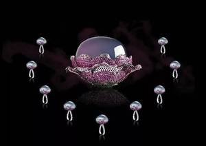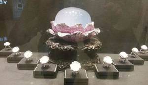 “昭仪之星”重达9499克拉,难得一见的旷世之宝,周围环绕九枚来自于同一块翡翠原石的翡翠钻戒,如众星捧月般美轮美奂。