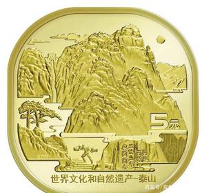 与以往圆形普通纪念币形制不同,“泰山币”的外形为圆角正方形;外接圆直径为30毫米,材质为黄铜合金,面额5元。背面主景图案为泰山,包括泰山松柏、泰山日出、挑山工、泰山石刻、南天门、十八盘以及玉皇顶等,图案下方刊有“世界文化和自然遗产——泰山”字样。