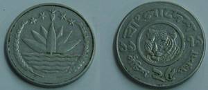 这是孟加拉的硬币,面额25波依夏,100波依夏=1塔卡(孟加拉的货币单位是“塔卡”,相当于人民币的“元”;辅币单位是“波依夏”,相当于人民币的“分”)。
