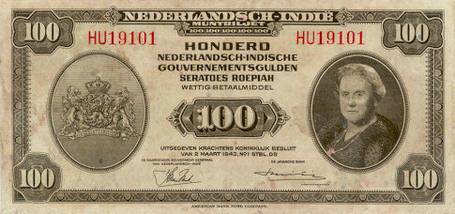这是荷属东印度20世纪四十年代发行的100古德纸币。荷属东印度即现今的印度尼西亚(当时是荷兰的殖民地)。纸币正面是荷兰女王威廉明娜和荷兰国徽。