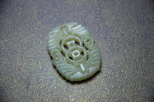 中国传统吉祥图案。由蝙蝠和古钱构成纹图。画面上蝙蝠前面摆有古钱。“蝠”与“福”同音;“前”与“钱”谐音;孔寓眼,意即眼前。