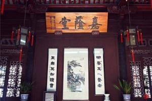 嘉荫堂分为前厅、中园、后楼三部分,前门临街,后门临水。衍庆楼即内宅堂楼,门楼上枋刻有“暗八仙”浅浮雕。楼内陈列着一幅幅惟妙惟肖、栩栩如生的名人轶事木雕。衍庆楼西北隅还有一座临水而筑、小巧玲珑的水秀阁,置身其中,近可闻风声、水声、鸟叫声,远可观小桥驳岸,老树苍翠,是一个修身养性的好去处。