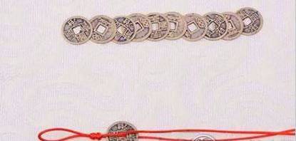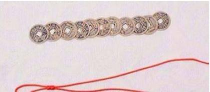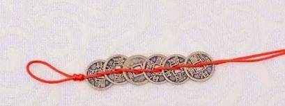 红线要按8字形穿绕两个铜钱: