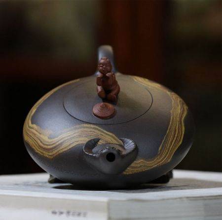 绞泥是紫砂工艺中一种比较特殊的工艺,运用两种或两种以上的不同颜色的紫砂泥料混合在一起制成的壶。绞泥壶的纹理构思奇巧,变化万千,给人强烈的视觉冲击,极具审美情趣。