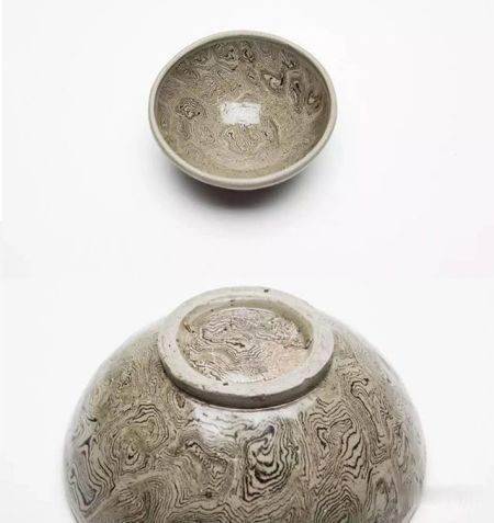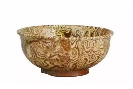 唐墓出土的绞胎器除了常见的枕头,还有杯、碗、盘、盒等。绞胎的纹理相对比较单一,一般以团花和木纹装饰为主,而到了宋代绞胎工艺已经基本成熟,麦穗纹、羽毛纹、木理纹各种纹样精彩纷呈,绞胎的技法完全成熟。