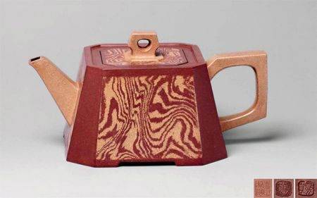 直到70年代中期,吕尧臣大师在研究了大量的绞胎资料决定做紫砂绞胎,第一把的八方凌云壶就非常的成功,这一把壶还在故宫博物院收藏。而吕大师也不断设计出新的绞泥紫砂,有精致典雅的玉玺壶,突破传统的华径壶和雨花提梁壶,纹理犹如长江黄河的天际壶,塑造山野之间清泉卵石真趣的小石冷泉壶等等一系列作品,将紫砂绞泥的技艺发扬光大。