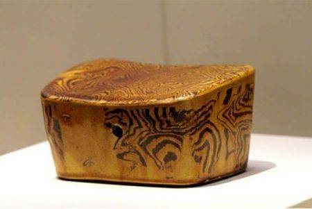 在1956年河南省陕县刘家渠唐墓中出土了绞胎器——绞胎枕,这一件绞胎枕用黄褐两色的陶土制成,花色肌理丰富。
