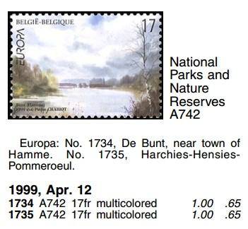 第二张图里面的第四张邮票是比利时1999年发行的“国家公园自然景色”欧罗巴系列邮票,全套共2枚,图中的邮票是第一枚。