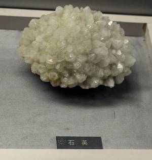 低温石英常呈带尖顶的六方柱状晶体产出,柱面有横纹,类似于六方双锥状的尖顶实际上是由两个菱面体单形所形成的。石英集合体通常呈粒状、块状或晶簇、晶腺等。纯净的石英无色透明,玻璃光泽,贝壳状断口上具油脂光泽,无解理。受压或受热能产生电效应。