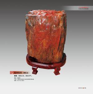 5.红色木化石:矿物纯净度高,粒度均匀组成单一,后期氧化铁质浸染并深入细胞,受Fe2O3的红色矿物相浸染,使木化石呈显红色。在木化石中整体呈红色者少见,大多数呈斑块状、花斑状或一团团的分布,当木化石中充填、交代物为玉髓质时,常展现一种似玛瑙状的外貌。