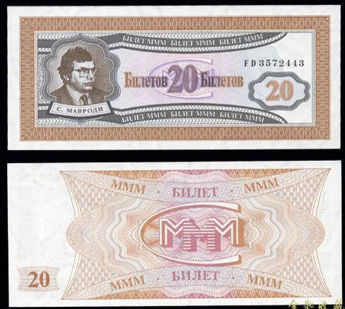 你的这张根本不是钱,而是俄罗斯MMM公司的股票,面额20卢布。戴眼镜的人是该公司得头目舍吉·马夫洛蒂。这是当时一个骗子公司,当时很多俄罗斯人都被骗了。这张股票一文不值。