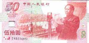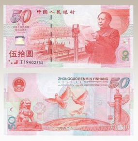 为了庆祝中华人民共和国成立五十周年,中国人民银行自1999年9月20日,面向全国发行"中华人民共和国成立五十周年"纪念钞一套一张,建国50周年纪念钞,面额为50元,发行数量为6000万套,主色调为红色,票幅长165毫米,宽80毫米。正面主景为开国大典盛况组合景,左侧贴有天安门与"50"组合的动态全息图案,左下方为盲文面额标记。背面为地球、和平鸽、铜狮、华表等组合图景,背面左上方为中华人民共和国"国徽"图案,右上方为"中国人民银行"汉语拼音字母和蒙、藏、维、壮四种民族文字的"中国人民银行"字样和面额。