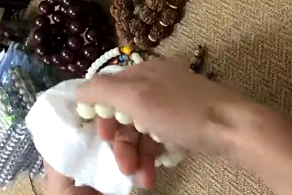 刚刚从市场上新购买的白玉菩提手串,首先要清理干净,用刷子和清水清理每一个地方每一个细节,尤其是孔口部位最容易被忽略,然后带上手套,慢慢盘玩盘到两个星期左右,控制一段时间,让包浆慢慢变硬,再过一段时间直接上手盘玩。每一个地方每一个细节都要盘到盘的时间越长,白玉菩提表面光泽度越好,呈现玉石光泽,和田白玉般的脂润感。