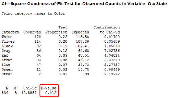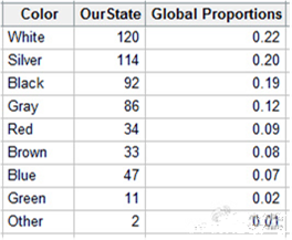 我们将使用先前博客中汽车颜色的比率的例子来进行演示。在这个例子中,由PPG公司报道的全球比率的数据是真实的,而我们“收集”的观测值只用于演示。