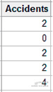 一位保险经纪人希望估测在特定的十字路口每月发生事故的数量,他在工作表中记录的事故数量是这样的: