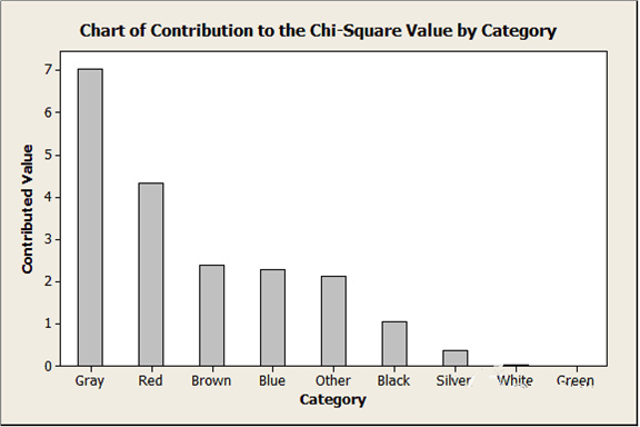 看看上面图形中“灰色”和“红色”的条形。灰色汽车的观测计数大于预期的计数;相反,红色汽车的观测计数小于预期的计数。