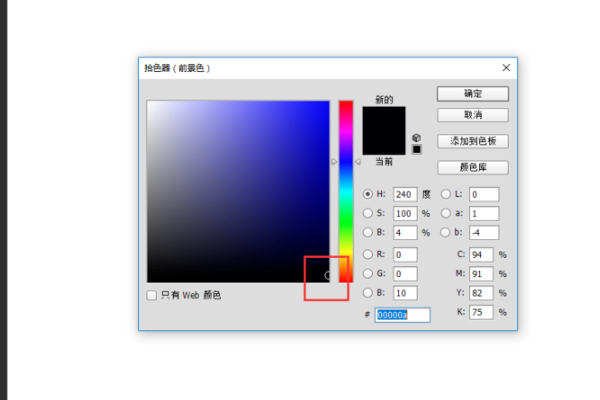 2、此时会弹出拾色器(前景色)对话框,可以看到色板右下角的圆圈,圆圈的位置就是默认选取的颜色位置。