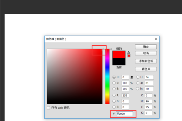 3、不断改变取色器的位置,可以发现下方的数值在不同的变化。此处以红色为例:把取色器上的圆圈拉倒右上角,中间竖着的渐变颜色拉到最上方,默认得到的就是大红色,下方【#FF0000】的数值就是红色的色值。