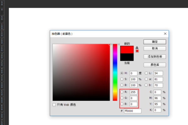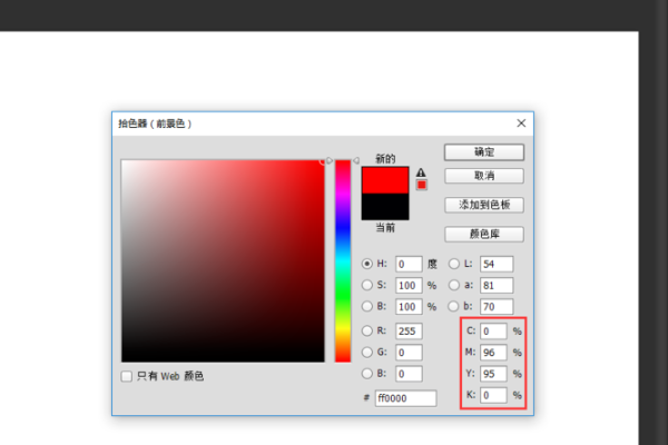 5、在RGB右侧可以看到CMYK的四色色值【0,96,95,0】。