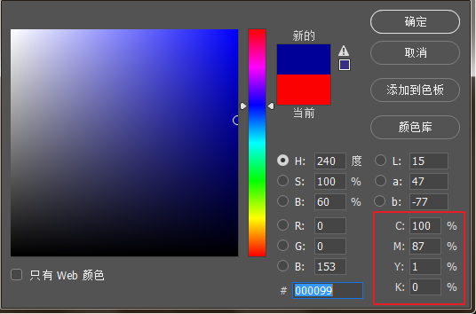 深蓝色的“CMYK”值是C:100%,M:87%,Y:1%,K:0%,颜色代码为#000099。CMYK,印刷四色模式是彩色印刷时采用的一种套色模式,利用色料的三原色混色原理,加上黑色油墨,共计四种颜色混合叠加,形成所谓“全彩印刷”。