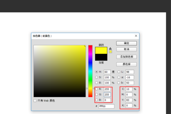 6、以此类推,通过移动取色器可以发现,常用颜色:黄色的色值就是RGB【255,255,0】,CMYK【10.0,83,0】,#FFFF00;