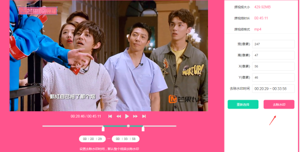 调整去除水印框的位置之后,上传的水印下方设置去除水印的视为片段位置