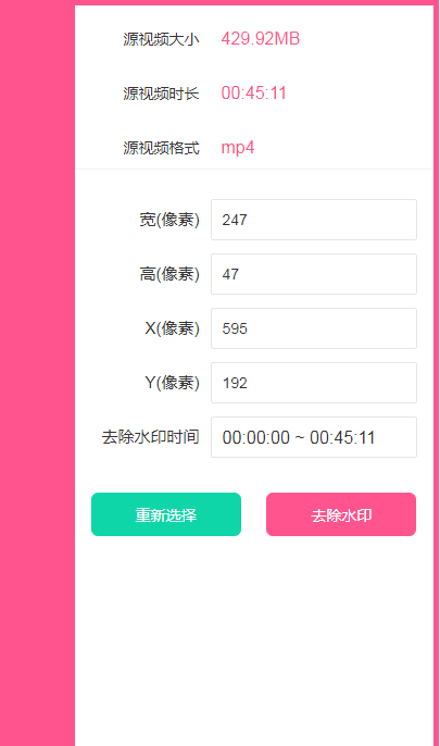 右边侧边栏有我们上传的视频的详细信息包括(源视频大小,源视频时长,源视频格式,像素以及我们计较要去水印的时间)一一显示的很清楚。
