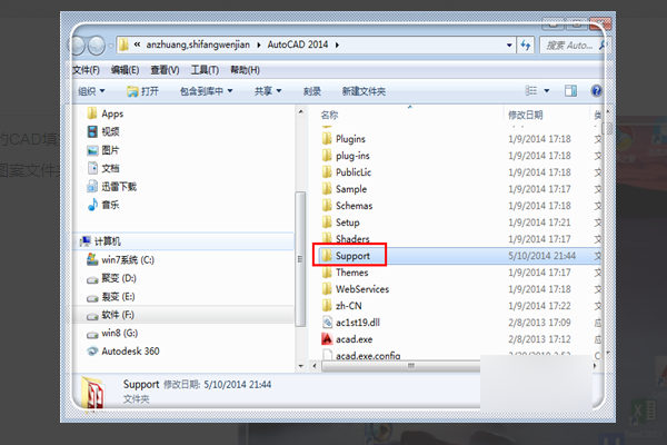 CAD填充图案路径存放在“support”文件夹里,具体找到CAD填充图案文件夹的操作步骤如下: