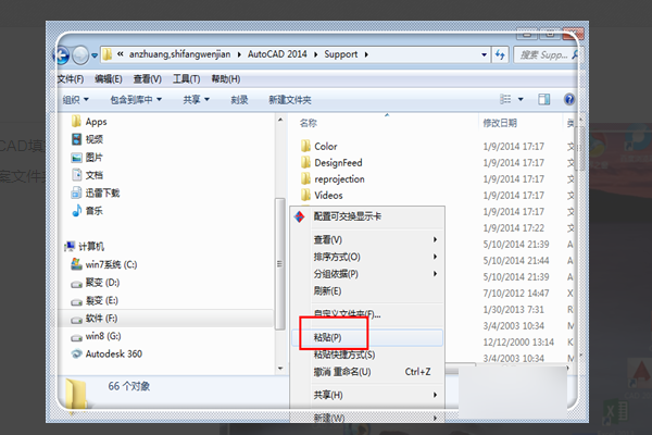 6、进入“support”文件夹中后右键点击,选择“粘贴”,将刚才复制的填充图案粘贴到里面即可。